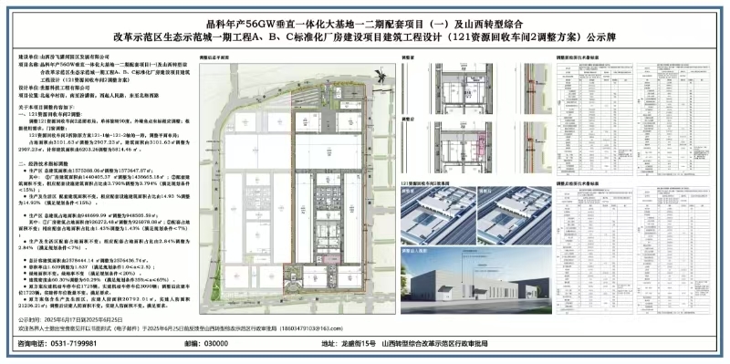 晶科年产56GW垂直一体化大基地一二期配套项目(一)及山西转型综合改革示范区生态示范城一期工程A、B、C标准化厂房建设项目建筑工程设计(121资源回收车间2)调整方案的公示