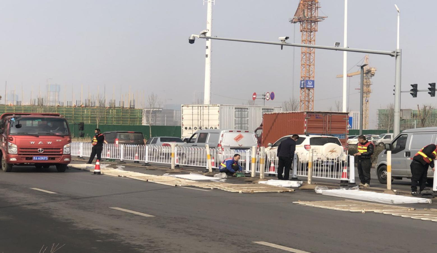 接到任务后,建管中心第一时间联系项目参建各方(省一建、鹏龙伟业、省建设计院、通昱造价、华厦咨询等单位)赶赴迎宾西街实地勘察、测量、记录,并与晋中市相关单位现场沟通。3月24日就确定设计方案:在道路中间安装隔离护栏,护栏加支座高度1.3米,总长度595米;从路边预埋的穿线管中安装路灯控制电缆,开启路灯照明。3月25日,工程正式开始施工,建管中心克服了栏杆采购困难的难题,增派多名施工技术人员突击安装、倒班作业,当日便完成了该道路全部隔离栏的安装工作。接下来,建管中心协调相关单位安排多辆电力工程车到场,高效完成路灯控制电缆安装工作,于3月29日完成通电调试工作并投入使用。在整个施工过程中,建管中心多次与交警、路政、电力等部门沟通协调,积极办理相关手续,尽最大努力避免因手续不全造成的开工延误、停工等问题,确保了工程的高效完工。