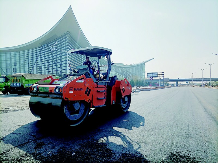 “上午完成了北半幅路面的沥青铺设,下午将完成南半幅路面的沥青铺设,之后将进入辅路收尾阶段。按照工作计划,这段道路将在9月30日前全部竣工,确保潇河新城投运。”中铁十四局现场施工负责人介绍,目前,该道路已经与潇河北街完成连通,只待最后一段油面铺完便可构成路网循环。潇河北路是沿潇河北岸而修建的道路,该道路西起人民路以东450米,东至太太路,全长约6公里,道路红线宽度为36米,设计时速40公里/小时,规划为城市次干路。从空中俯瞰,潇河北路绕潇河新城而行,将潇河国际会议中心、配套酒店项目、潇河国际会展中心串联为一体。“潇河北路是潇河新城的配套路网之一,潇河新城段已经完成水稳铺设,部分路面已经铺油。因潇河北路与张花南街、会展北街有路口衔接,待衔接部完成后,即可进行油面铺设。目前,我们正利