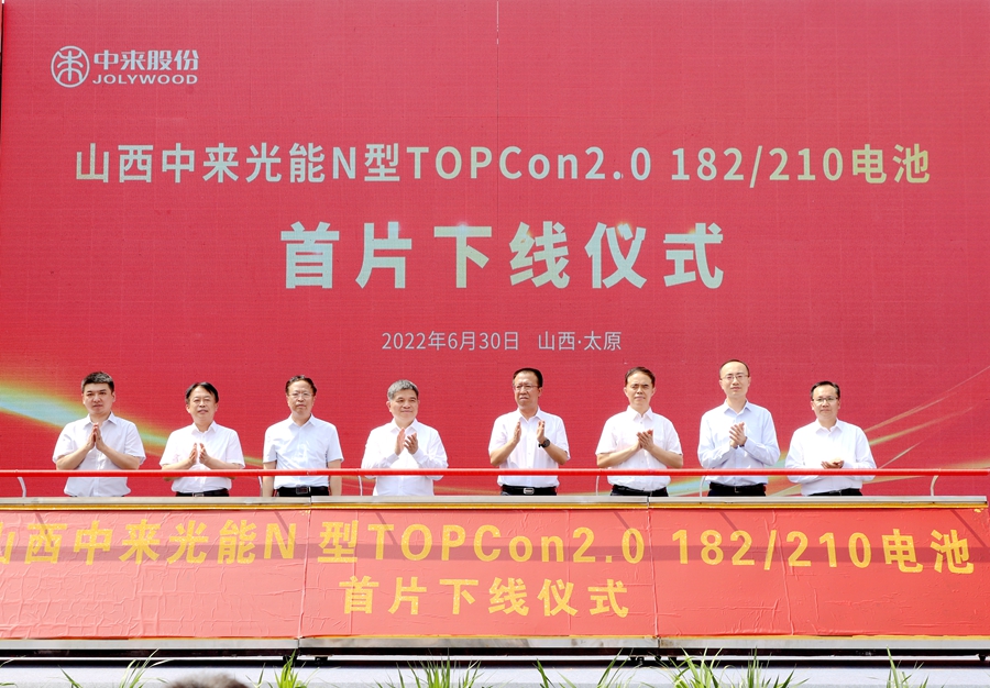 在中国共产党101岁生日到来之际,6月30日,山西中来光能首片N型TOPCon2.0 182/210电池在综改区下线,标志着山西中来光能年产16GW高效单晶电池智能工厂项目一期开始投产运营。省发改委二级巡视员霍喜福,综改区党工委委员、管委会副主任崔俊林,省科技厅党组成员、副厅长张克军,中来股份董事长林建伟出席产品下线仪式。