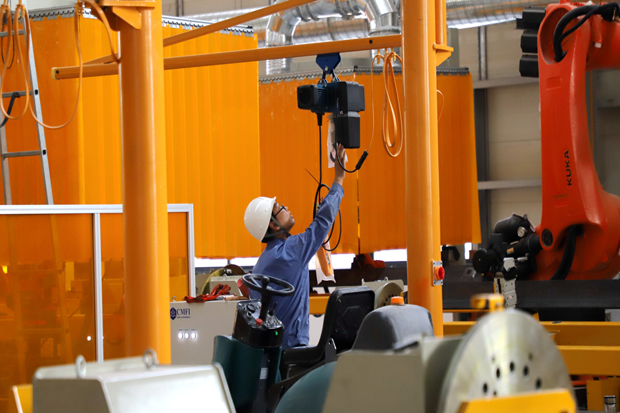 联合厂房地面平整光洁、视野明亮开阔,眼到之处,是各式机器人灵活运转,宛如走进了汽车生产车间,完全颠覆了人们对传统制造业车间的印象。在刚刚调试好的一台全自动焊接机器人前,根据预先设定好的程序,全自动焊接机器人挥舞机械臂,火花四射间,只需短短几十秒,一根钢管便变成了塔机标准节骨架。加工完成后,夹具夹起工件,再自动传输到下一个工序。