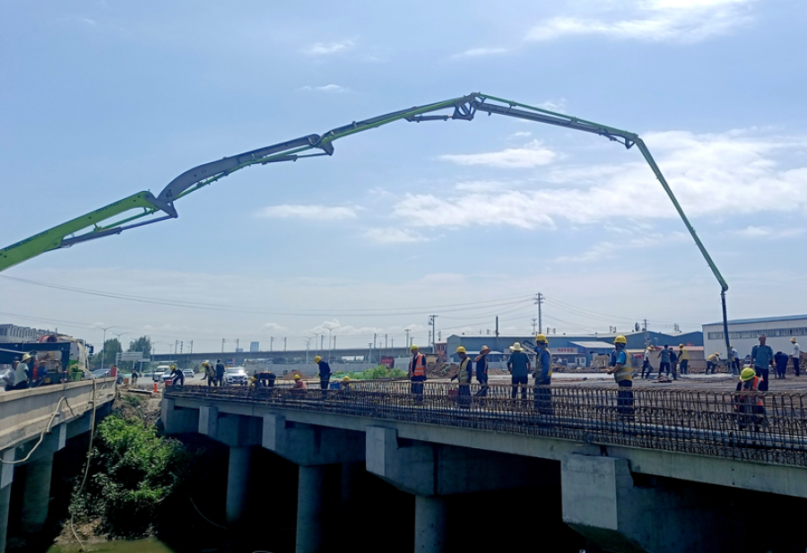 太榆退水渠桥是小牛线西延的重要枢纽节点。在该节点施工现场,大型吊车大臂往返摆动、提升,不断将建设物料从施工便桥吊至桥面。伴随着泵车的轰鸣声,混凝土从泵车输送臂中倾泻而出,施工人员有条不紊地进行振捣作业。“太榆退水渠,水面宽度约30米,且水流湍急,北侧又紧邻10KV高压线杆,施工工作面狭窄,且地质情况复杂,水位又常年处于变化之中,没有固定规律,给施工带来极大困难和挑战。我们严格按照时间节点推进项目进度,确保按期实现主线全线贯通,确保9月份潇河国际会议中心道路畅通。”项目负责人说道。