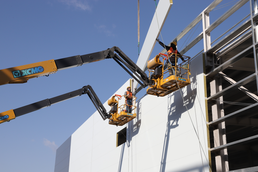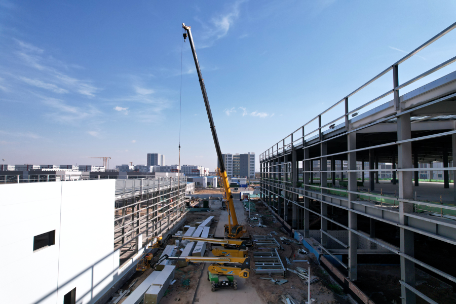 走进项目建设现场,材料运输车有序穿梭,曲臂自走升降车沿着墙面上下移动。随着操作人员的指令声下达,大型吊车挥舞大臂将巨大的岩棉夹芯板稳稳地运到指定位置。“从今年8月12日进场施工以来,建筑面积1.7万平方米的东区A05三代半导体技术创新中心试验验证中心和建筑面积5000平方米的A10综合库房,仅用三个多月时间就完成了主体结构建设,开始进行墙面金属围护结构的安装及内部防火涂料喷涂施工等。”建设单位十一科技现场施工负责人介绍,项目部在做好安全生产的前提下,针对冬季施工实际情况,为100多名奋战在东西两区建设现场的工人做好后勤保障,为室外作业人员配备御寒装备,确保项目顺利推进。