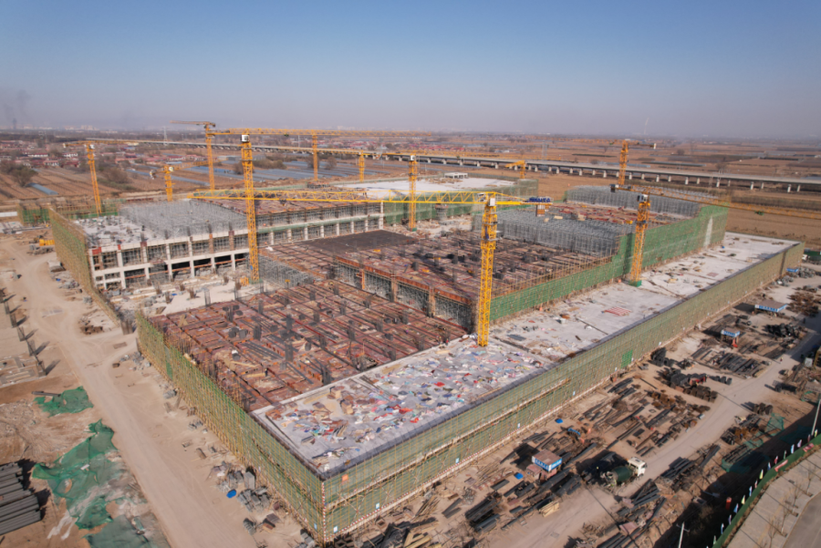 走进项目建设现场,塔吊高耸、防护网密布、脚手架交错,多个单体建筑已经拔地而起。行车平台建设完成后,从空中俯瞰,2号仓库和3号仓库已经连为一体。“除2号进港仓库和3号出港仓库外,项目还同步启动了4号电商仓库和综合办公楼、倒班宿舍楼的建设。由于每个单体项目建筑比较大,目前现场有11座塔吊在同步运行。”项目现场负责人介绍。