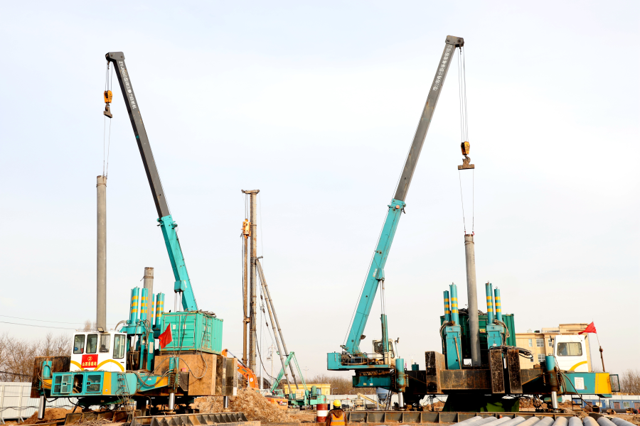 在项目东北角,随着搅拌桩钻头的旋转,3根桩基钻孔逐步形成,翻腾的水泥土体携带着地下的热气四散开来。不远处,一台台静压桩机正将一根根水泥圆桩持续压入地下。“桩基深度从24米到29米不等,整个一期第一步的桩基工程量为12万多延米,目前已经打桩10万延米。同时,完成降水井100余眼。”现场施工负责人介绍,面对工期紧、任务重、技术难点多等情况,项目团队迎难而上,通过反复优化专项施工方案编制、提前做好安全防护保障等措施,倒排工期、挂图作战,确保项目顺利推进。按照施工计划,将在春节之前全部完成桩基工程,为后续开挖及各个单体建设奠定基础。