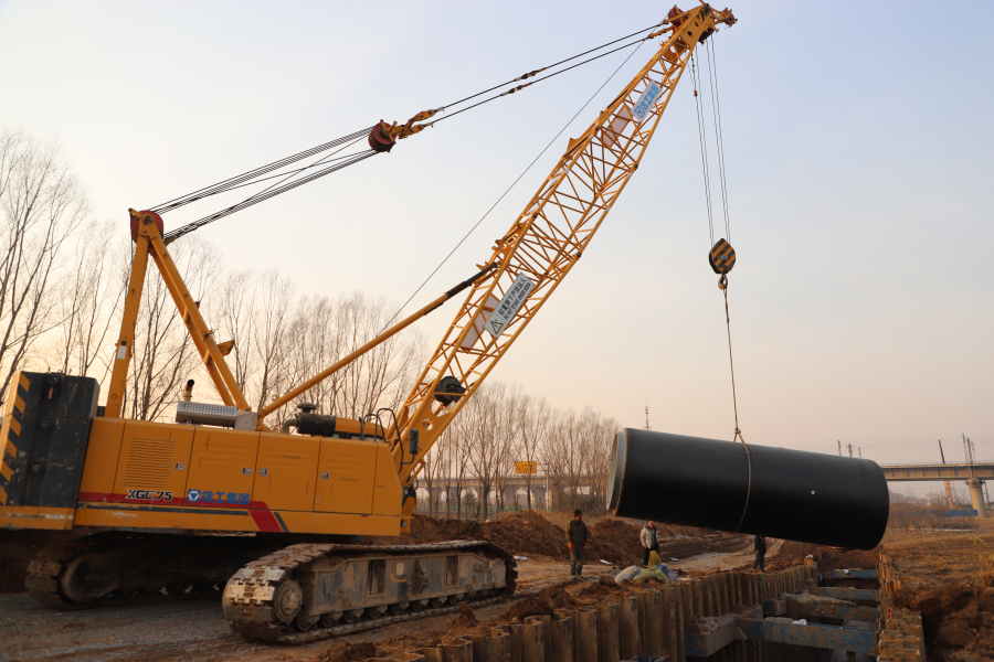 “冬季施工虽然艰苦,却是原水管线施工的关键期,我们要全力以赴抢进度、赶工期。”现场负责人介绍,由于施工区域地下水位较高,地表土壤也呈现水饱和特点,温暖天气地下水容易渗出不利于施工。冬季气温降低施工,更有利于开挖、运输和安装。走进项目现场,一根根钢桩并排绵延,挖掘机车臂不停伸缩挖掘土面。不远处,长约数百米的沟槽已经开挖完毕,一架大型吊装机直立在沟槽旁边,钢缆牵引下,是一根粗大、空心的管道;几名管道工人在一旁监护,双方相互配合下,管道平稳落进沟槽中央。