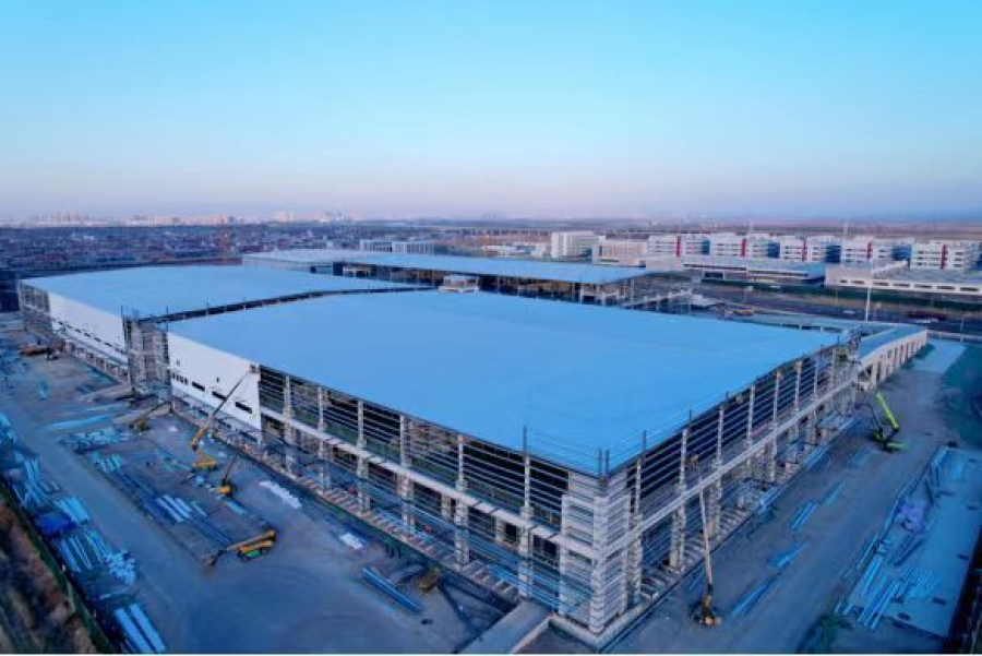 该项目于2024年3月6日进场施工,项目部倒排工期、挂图作战,先后完成建渣、碎石强夯置换、土方回填和预制管桩工程等。2024年7月份进入地上结构施工阶段后,项目建设不断加速,最高峰时有700多名建设者在现场奋战,昼夜加班加点,各单体同时施工,用时30天完成60重型盘扣架架体施工,41天完成1、2、3号仓库及卸货平台顶板施工,并于2024年国庆节完成3栋生产仓库及卸货平台一层混凝土施工,2024年10月6日启动二层钢结构安装,2024年12月6日顺利完成主体封顶的任务目标,比预期工期提前近10天。